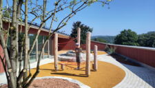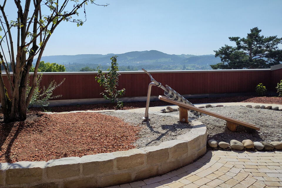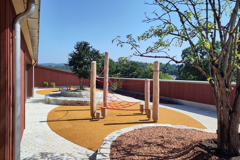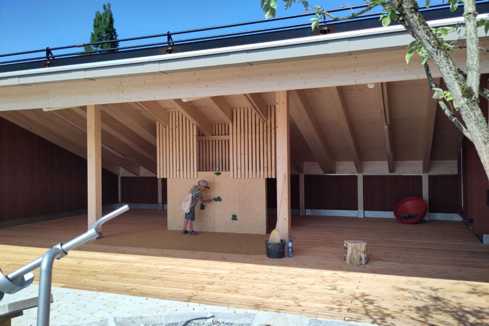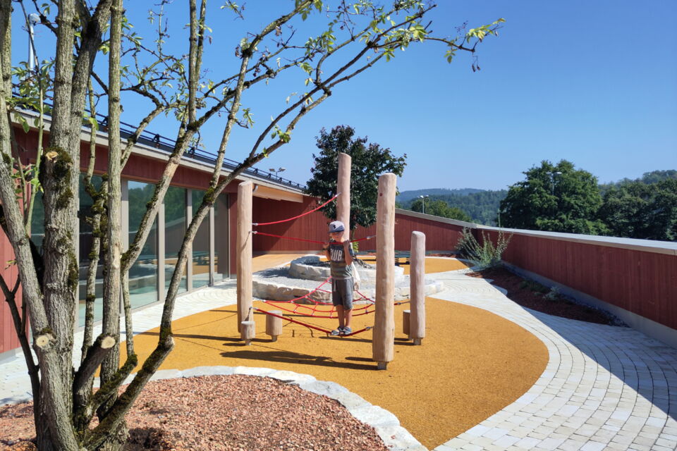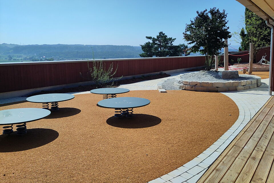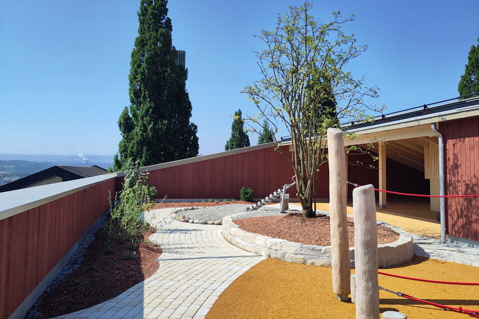 für die einwohnergemeinde döttingen durften wir zusammen mit batimo-architekten einen spielplatz im 3. obergeschoss realisieren. die fläche im erdgeschoss war zu klein für sechs kindergartenklassen, daher konnte auf dem dach des holzbaus ein einzigartiger spielplatz erstellt werden. geschwungene rundwege fassen spielflächen und werden mehrheitlich mit grünflächen von der 1.2m-hohen brüstung getrennt. eine kletterwand und eine spielwand sind unter schützendem dach und bieten auch nischen um sich zurück zu ziehen.