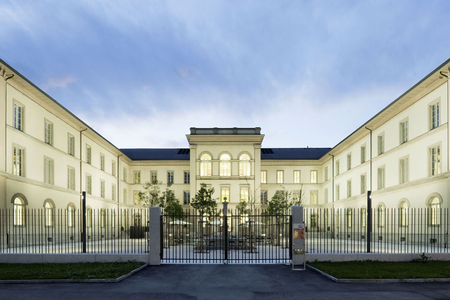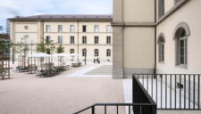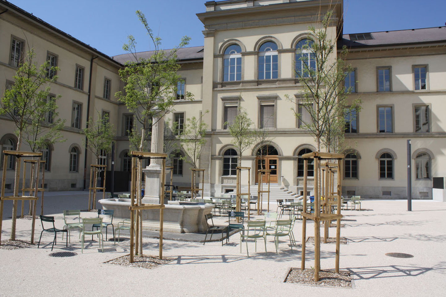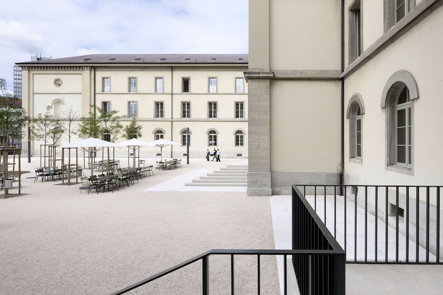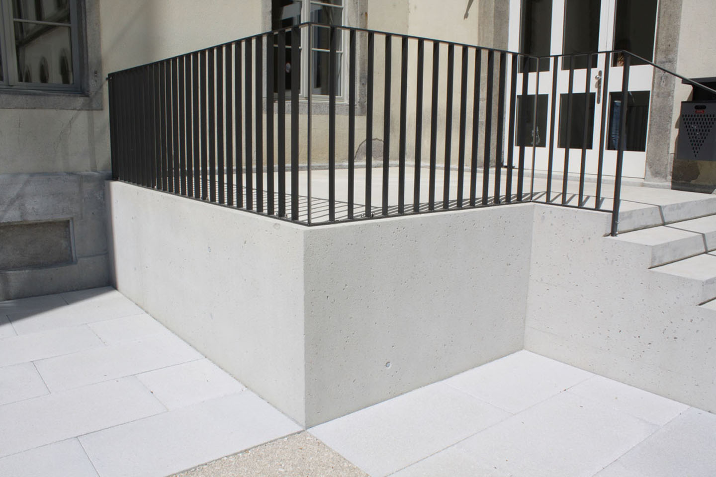 die neuanordnung der treppenanlagen zu den eingängen basiert auf historischen grundlagen und bauplänen. die hofgestaltung wurde unter denkmalpflegerischen rahmenbedingungen durchgeführt.