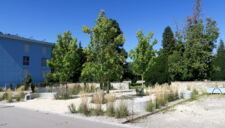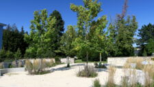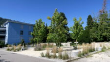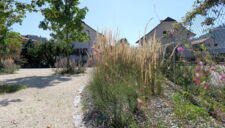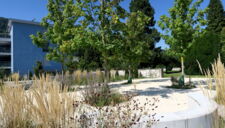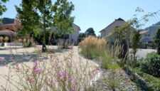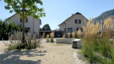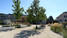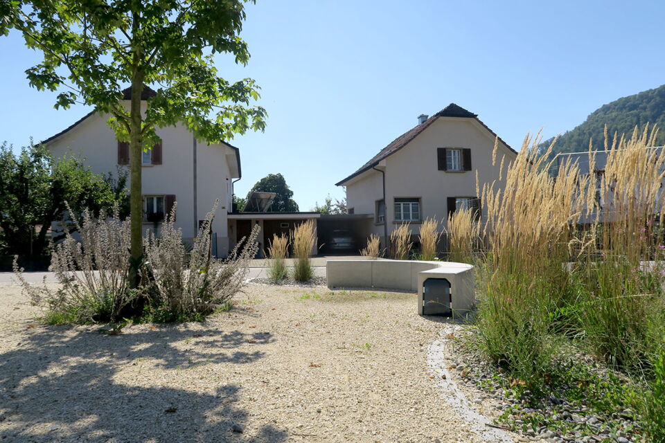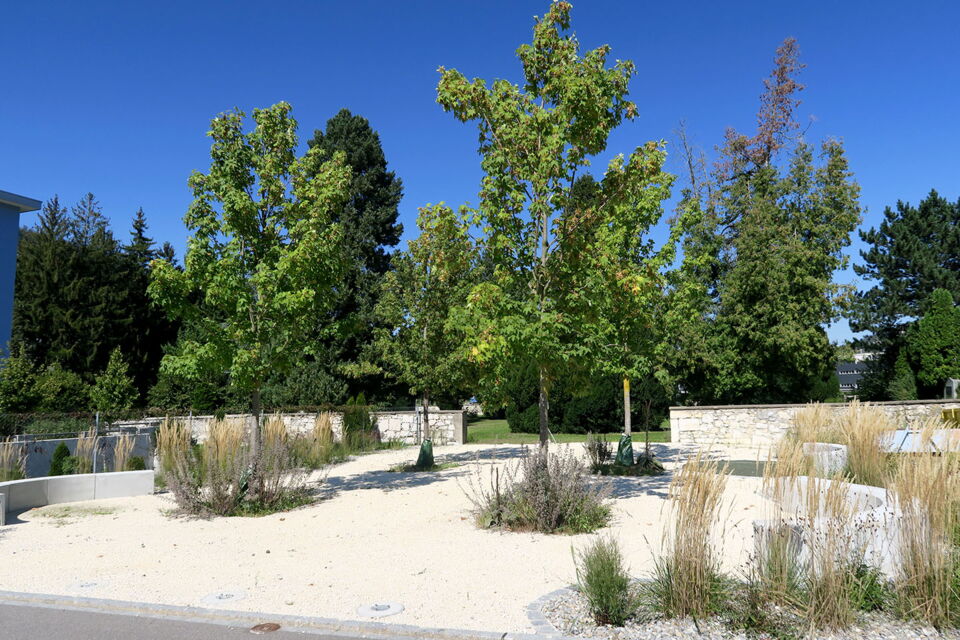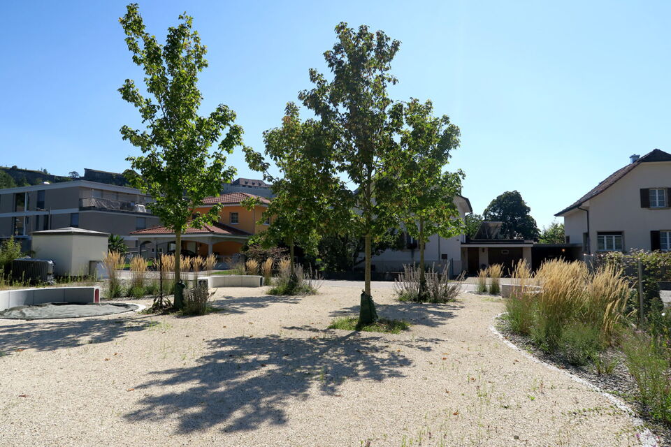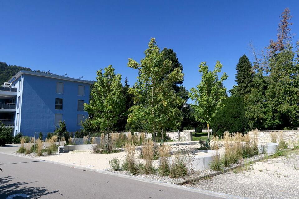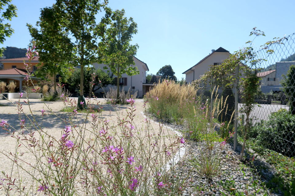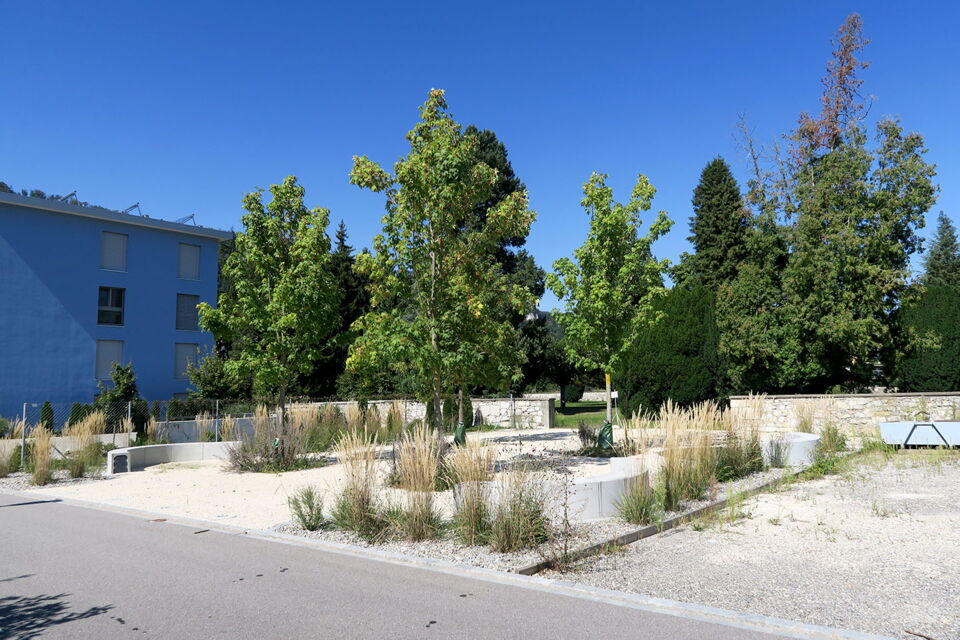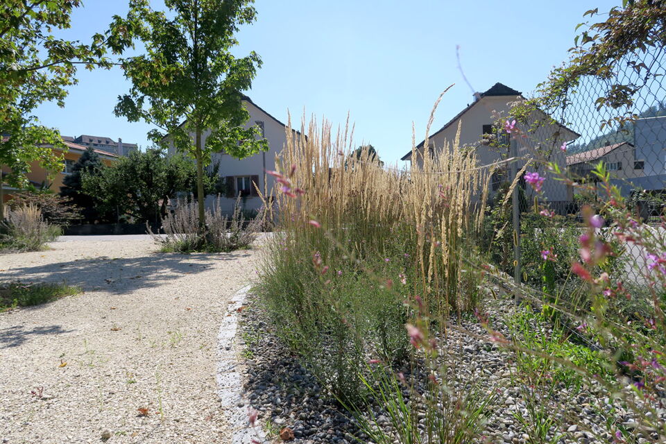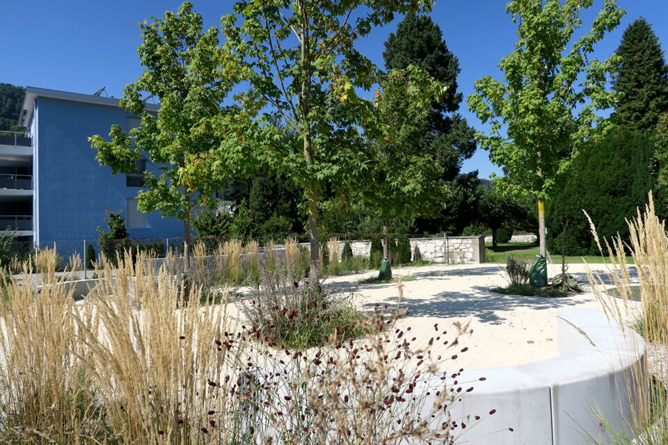 an der mauer des alten friedhofs konnte eine brache bespielt werden. zeitgleich wird an einem nutzungskonzept für die friedhofsfläche gearbeitet. sitzstufen fassen den platz und zeichnen wellen zwischen die üppige bepflanzung und den chaussierten raum. ein bergahorn-quartett entwickelt sich zum schattendach, ein sandkasten bestückt als spielangebot und lässt viel raum für diverse nutzungen, zum beispiel wäre eine buvette denkbar.
