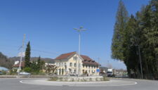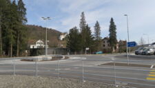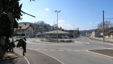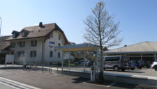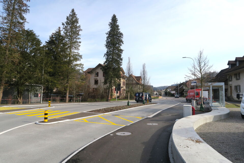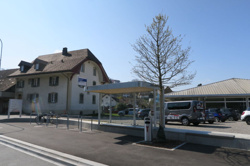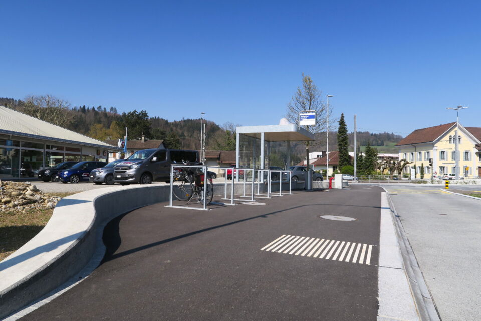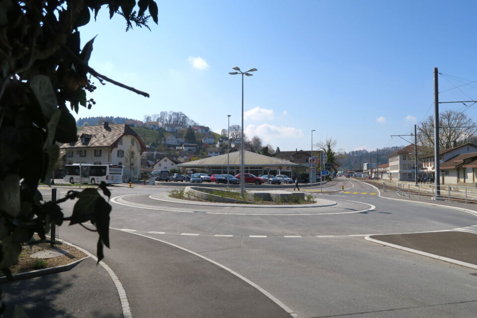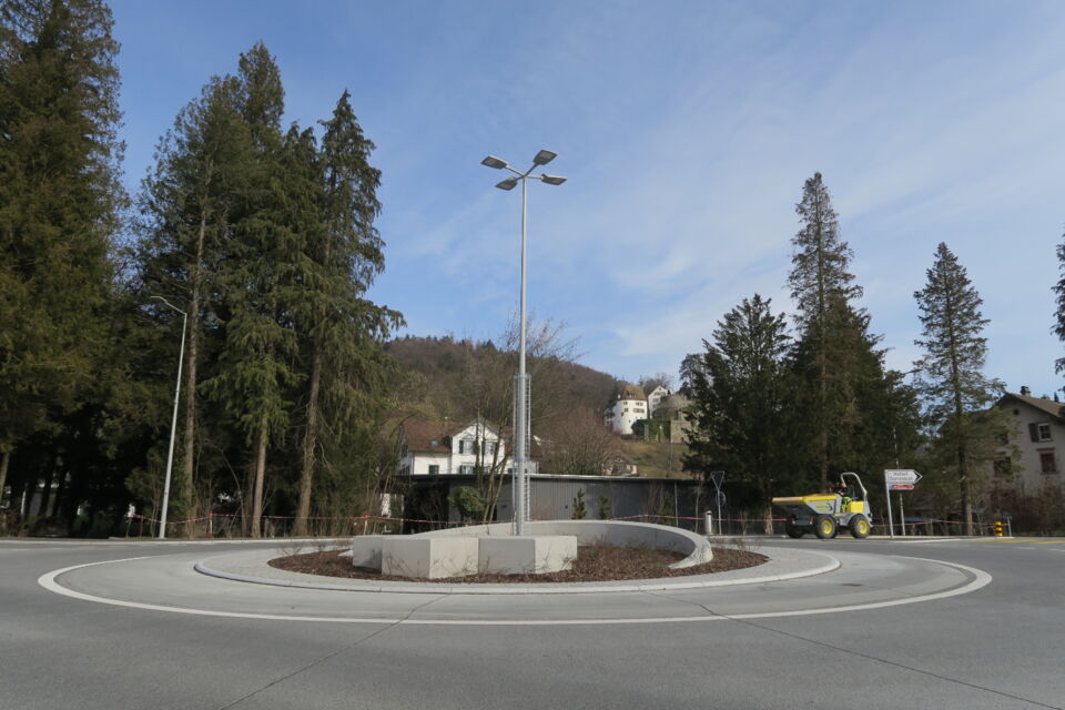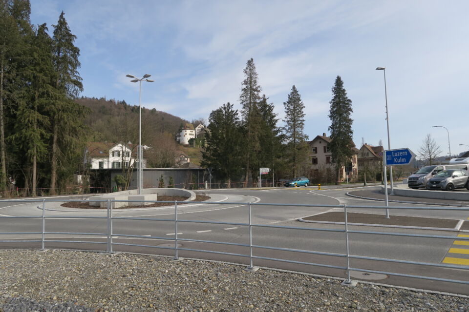 dem umbau des knoten k242/250 in einen kreisel musste das alte postgebäude weichen. so wurde raum freigespielt um den beiden historischen gebäuden an der alten kreuzung mehr präsenz zu ermöglichen. die historische grosszügigkeit der ursprünglichen kreuzung an diesem zentralen ort von gemeinde und wynental, konnte so trotz streng flankierenden verkehrsräumen wieder ermöglicht werden. eine gestockte sitzmauer grenzt den benachbarten ausstellplatz ab, ohne den raum zu begrenzen. die bushaltestelle fügt sich darin ein und lässt durch ihre leichtigkeit den blick auf das bruderhaus frei. das gemeindewappen ziert abstrahiert als betonelement den kreisel. die sicherheit des lv zu den bahngleisen wird durch einen standortgemässen handlauf gewährleistet.