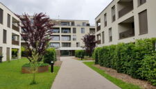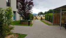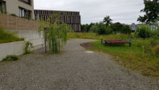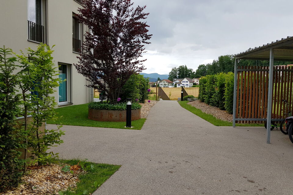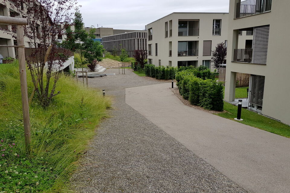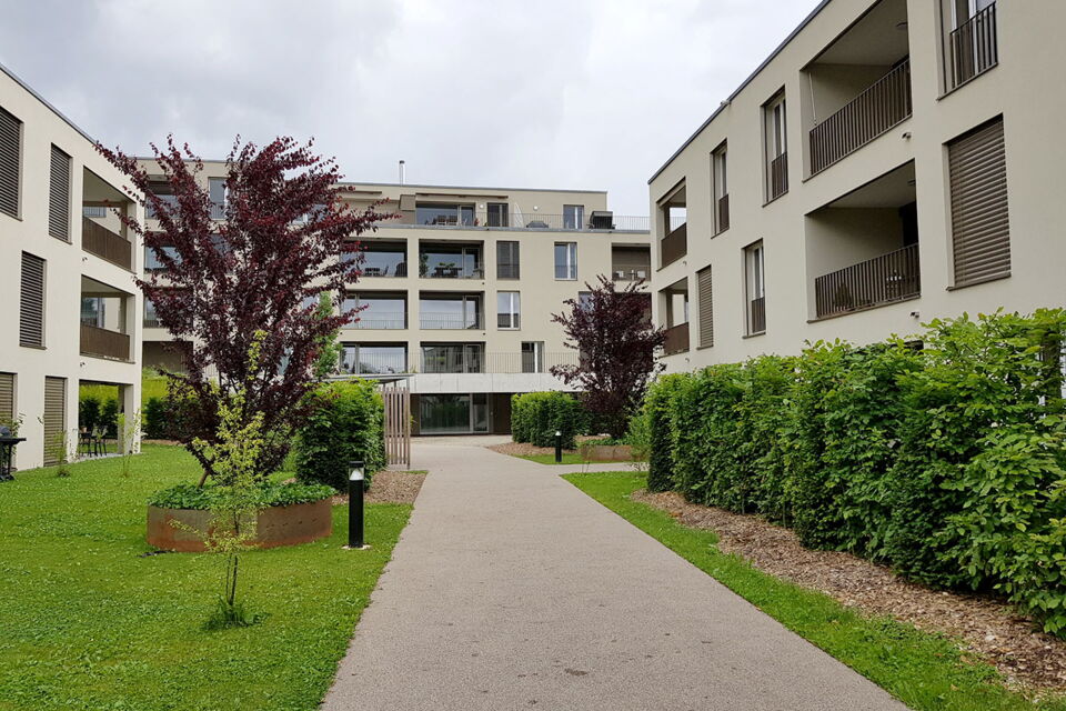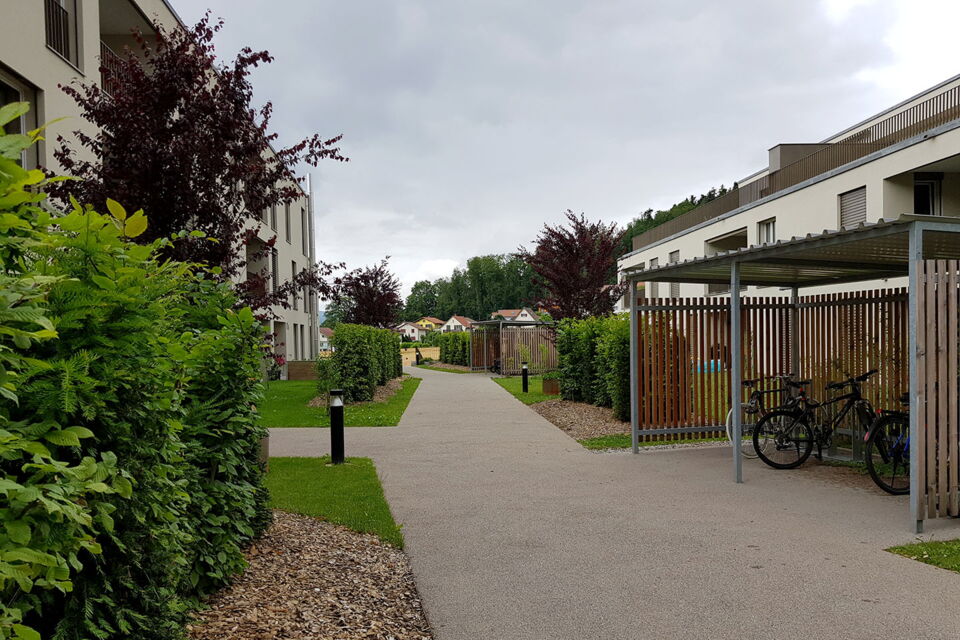 rund um die wohnblöcke sorgt eine attraktive bepflanzung aus einheimischen hecken, sträuchern und bäumen für vertraute privatsphäre. üppige blumenwiesen säumen sitzplatz- und rasenflächen, während geschwungenen zugangswege aus farblosem asphalt und chaussierung die spiel- und erholungsflächen zusammenführen und elegante treppenanlagen den bachzugang erleichtern.