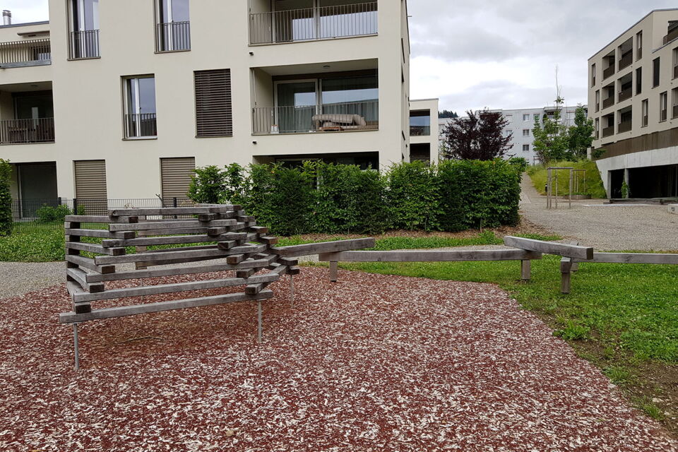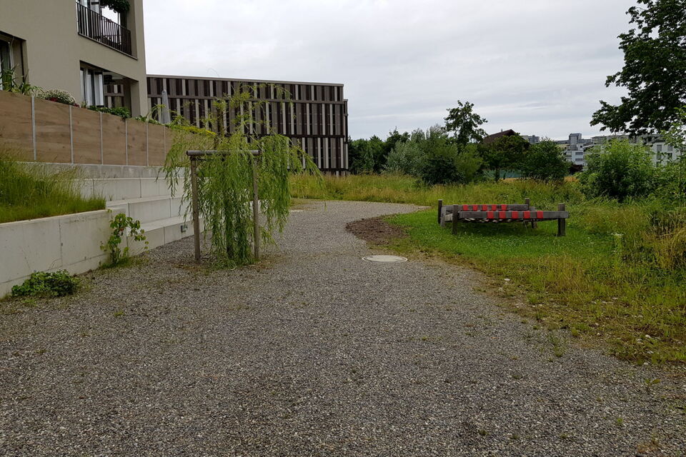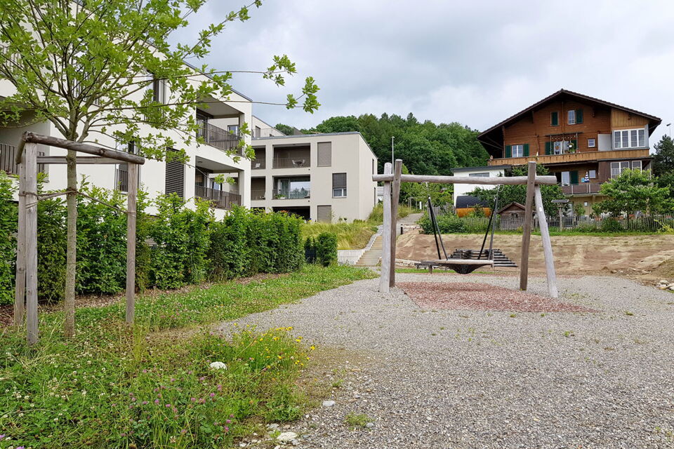 die wohnüberbauung "drillinge im garten" liegt an einem sanften hang zum dorfbach und grenzt an die dahinterliegende landwirtschaftszone. die grosszügige grünanlage sichert die anfällige lage durch ausgeklügelte zugangswege und durch verborgene schutzdämme raffiniert und unauffällig vor dem erhöhten hochwasserrisiko.